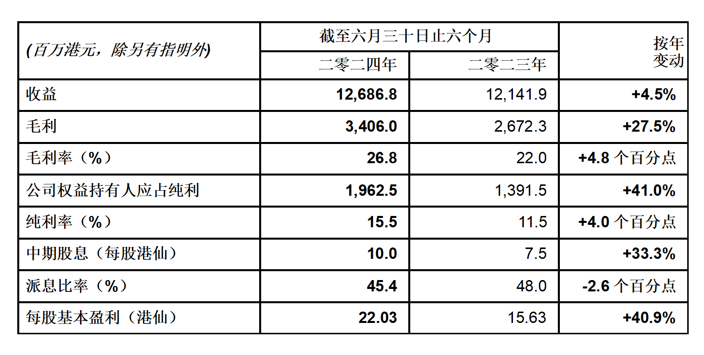 于二零二四年上半年,集團(tuán)綜合收益同比上升4.5%至12,686.8百萬港元。毛利上升27.5%至3,406.0百萬港元,毛利率亦有所改善,由二零二三年上半年的22.0%增至26.8%。與此同時,公司權(quán)益持有人應(yīng)占溢利大幅增加41.0%至1,962.5百萬港元。