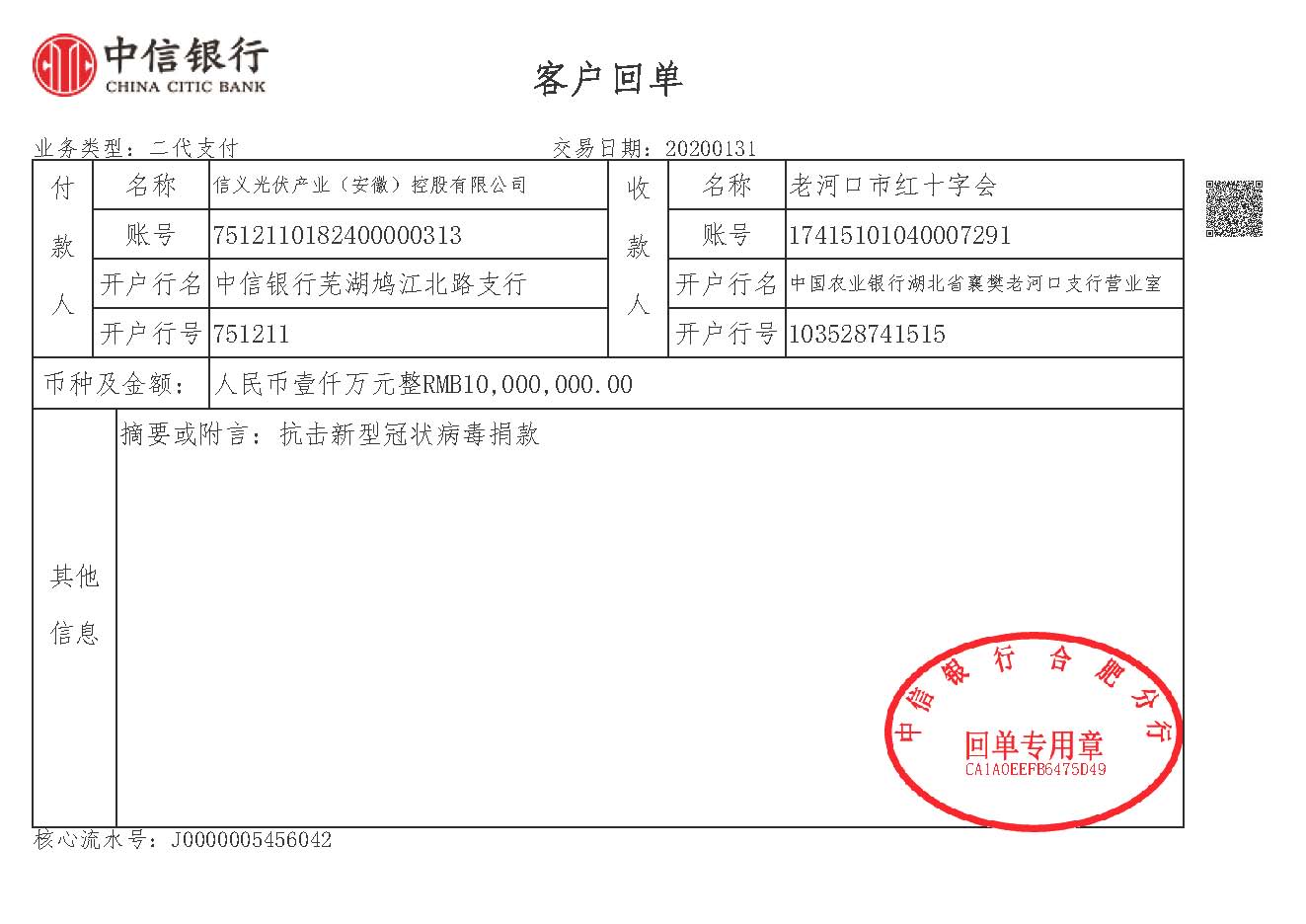 信義集團(tuán)有四家上市公司,分別是信義玻璃控股有限公司,信義光能控股有限公司,信義能源控股有限公司,信義汽車玻璃香港有限公司,集團(tuán)始終秉持“信譽(yù)至上、義氣爭榮、自強(qiáng)不息、善待天下”的宗旨,在重大疫情面前用實(shí)際行動回報社會,切實(shí)履行企業(yè)的責(zé)任和擔(dān)當(dāng),為支援老河口市盡一份力,一起攜手助力疫情防控,同舟共濟(jì),共克時艱。讓我們一起為湖北加油!為中國加油!