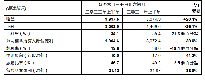 於二零二二年上半年,集團(tuán)實(shí)現(xiàn)綜合收益9,697.5百萬港元,主要來自旗下太陽能玻璃及太陽能發(fā)電場兩個主要核心業(yè)務(wù)分部,按年增加20.1%。毛利為3,302.9百萬港元(二零二一年上半年:4,469.6百萬港元)及毛利率34.1%(二零二一年上半年:55.4%)。集團(tuán)錄得純利1,904.6百萬港元(二零二一年上半年:3,072.4百萬港元),純利率為19.6%(二零二一年上半年:38.0%)。每股基本盈利為21.42港仙(二零二一年上半年:34.87港仙)。